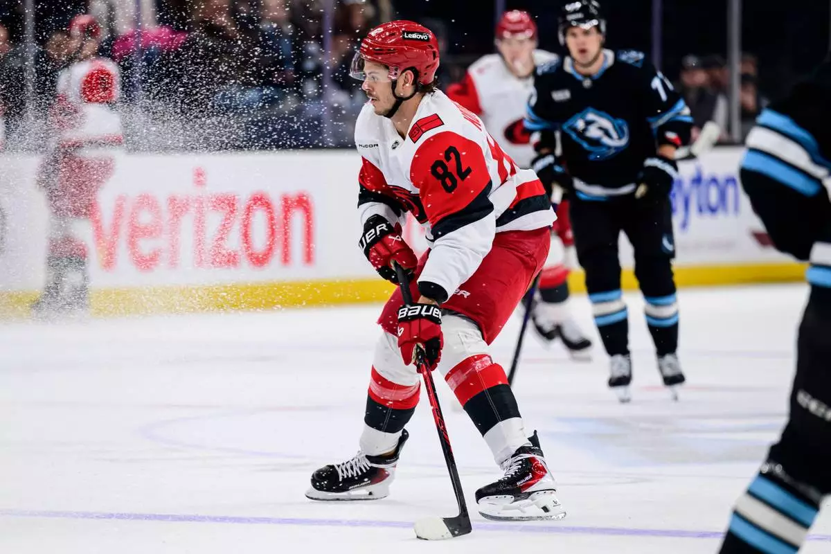 Carolina Hurricanes center Jesperi Kotkaniemi (82) skates with the puck during the first period of an NHL hockey game against the Utah Mammoth, Saturday, April 11, 2026, in Salt Lake City. (AP Photo/Tyler Tate)