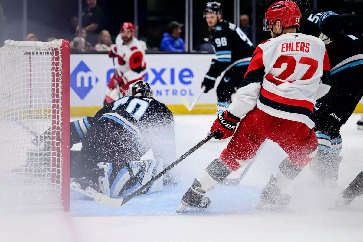 Carolina Hurricanes left wing Nikolaj Ehlers (27) looks to tip in the puck past Utah Mammoth goaltender Karel Vejmelka, left, during the first period of an NHL hockey game, Saturday, April 11, 2026, in Salt Lake City. (AP Photo/Tyler Tate)