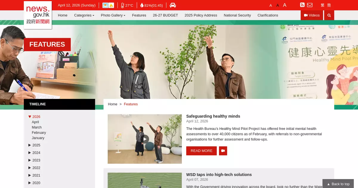 Launched in August 2024, the Health Bureau's Healthy Mind Pilot Project has offered free initial mental health assessments at three District Health Centres and District Health Centre Expresses. As of February 2026, over 40 000 citizens have undergone assessments and those in need have been referred to non-governmental organisations for further evaluation and follow-ups.