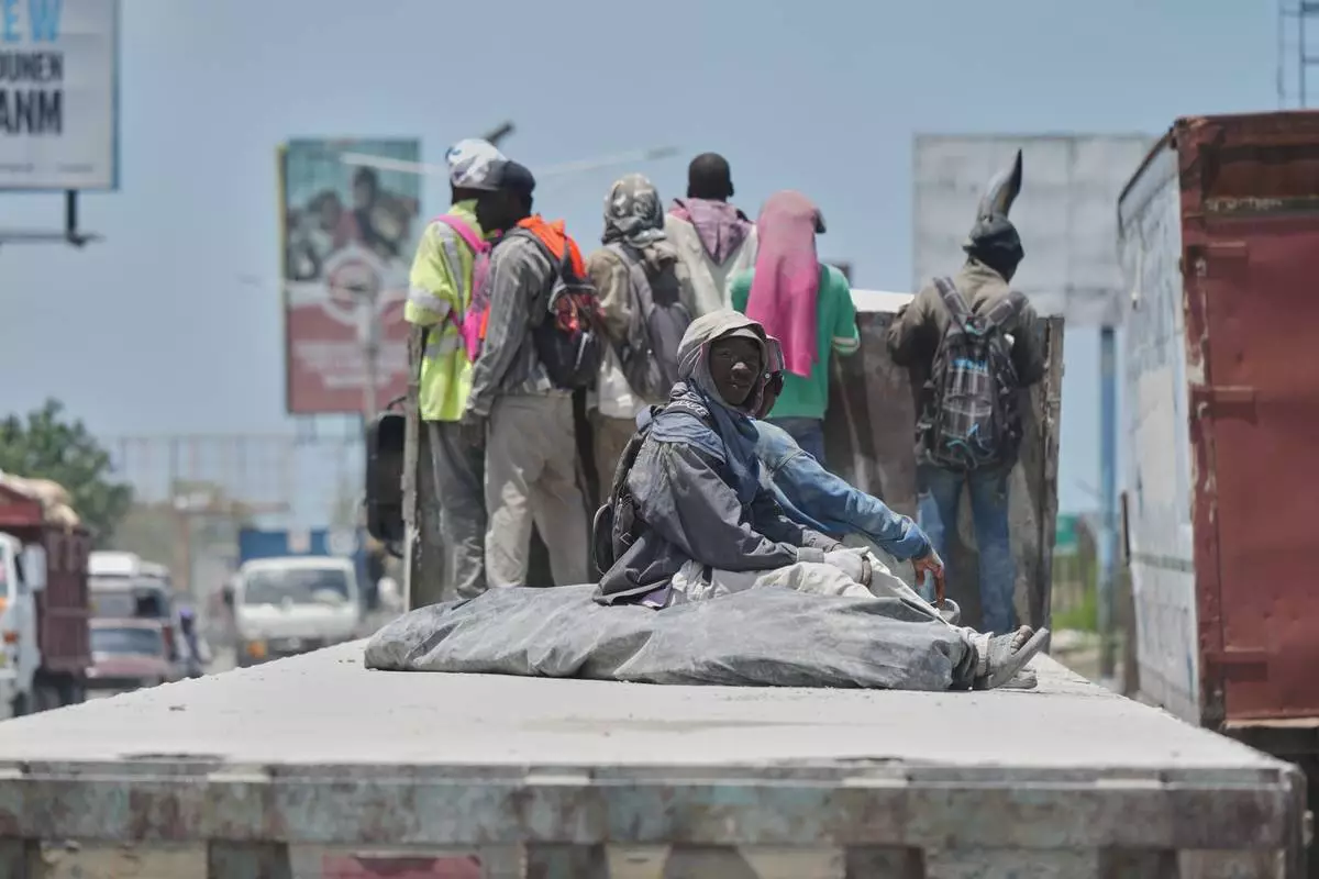 Workers ride in a cargo truck transporting cement in Port-au-Prince, Haiti, Tuesday, April 7, 2026. (AP Photo/Odelyn Joseph)
