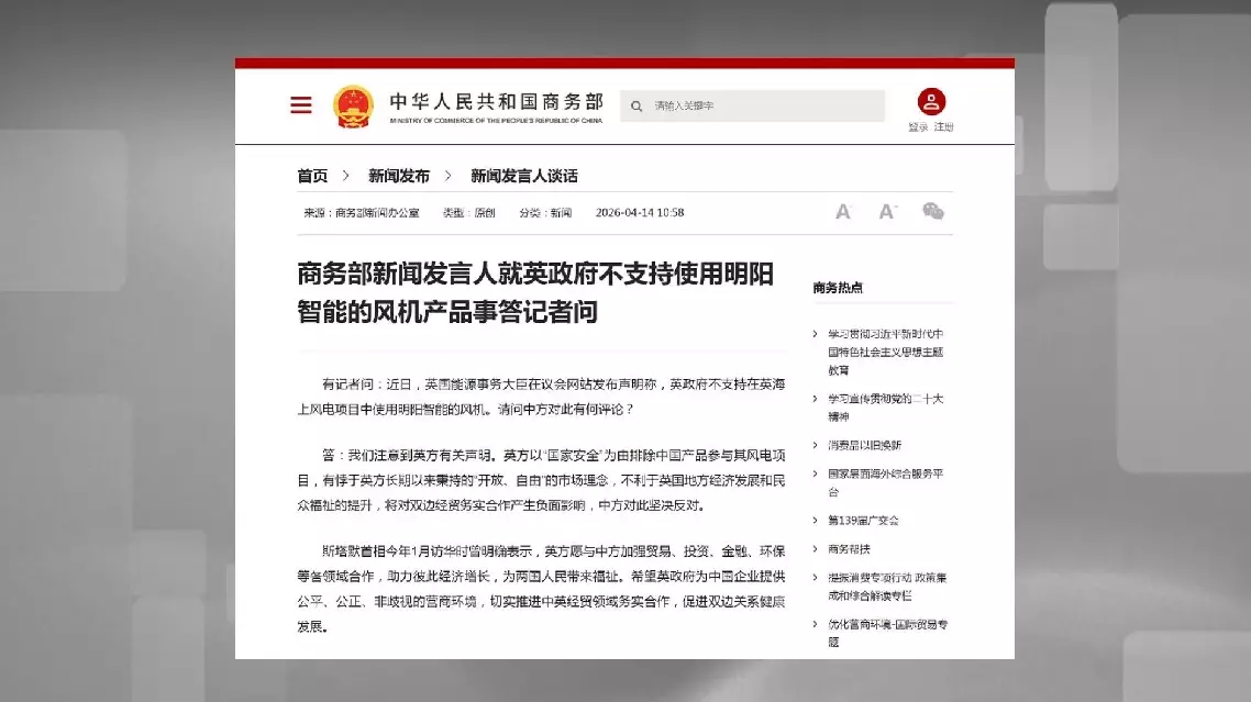 A spokesperson for China's Ministry of Commerce made the remarks in response to the British government's recent statement that it does not support the use of wind turbines from Chinese manufacturer Mingyang Smart Energy Group Co., Ltd in UK offshore wind projects.