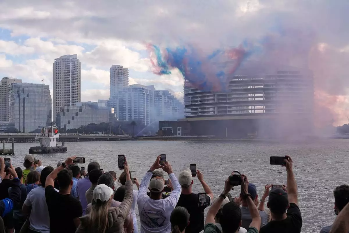 People watch pyrotechnics just before the controlled implosion of the former Mandarin Oriental Hotel on Brickell Key, Sunday, April 12, 2026, in Miami. (AP Photo/Rebecca Blackwell)