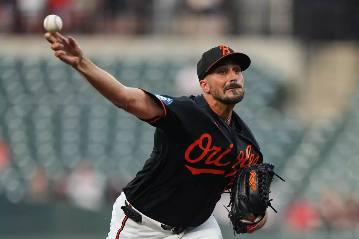 Baltimore Orioles starting pitcher Zach Eflin delivers during the first inning of a baseball game against the Texas Rangers, Tuesday, March 31, 2026, in Baltimore. (AP Photo/Stephanie Scarbrough)