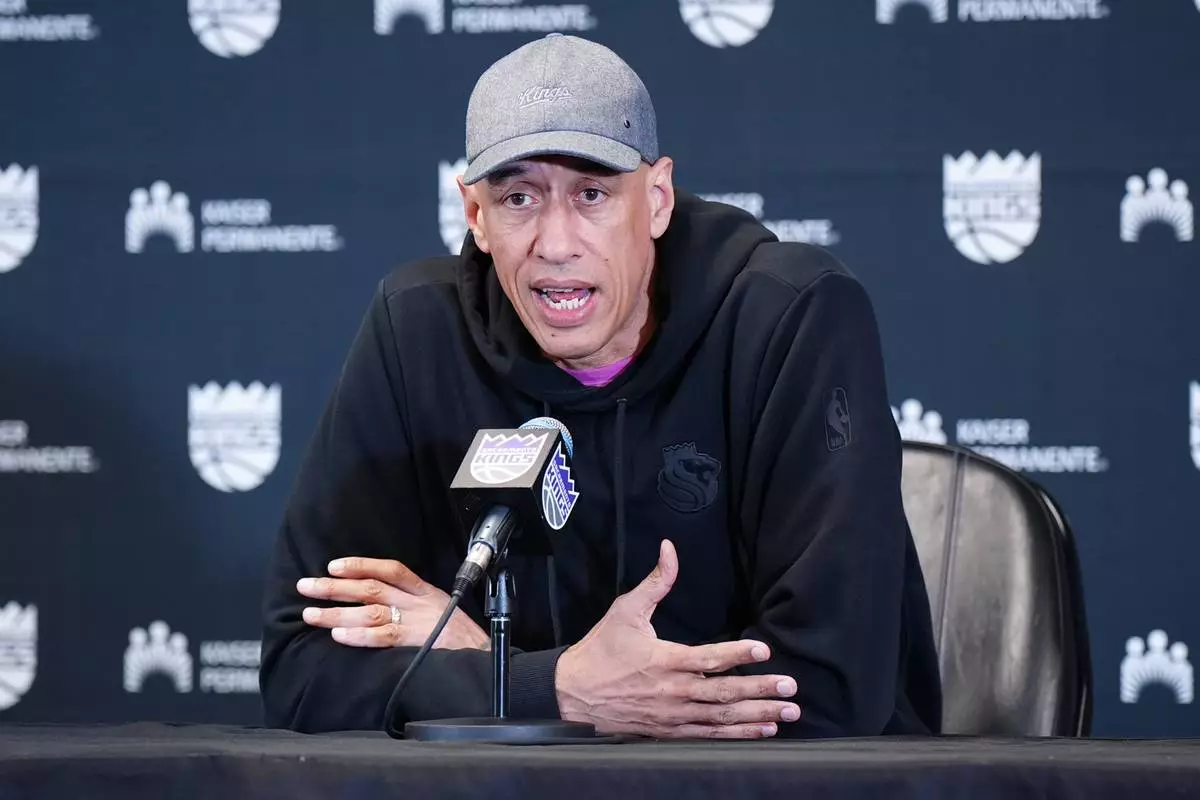 Sacramento Kings head coach Doug Christie speaks to the media before an NBA basketball game against the New Orleans Pelicans, Friday, April 3, 2026, in Sacramento, Calif. (AP Photo/Alan Greth)