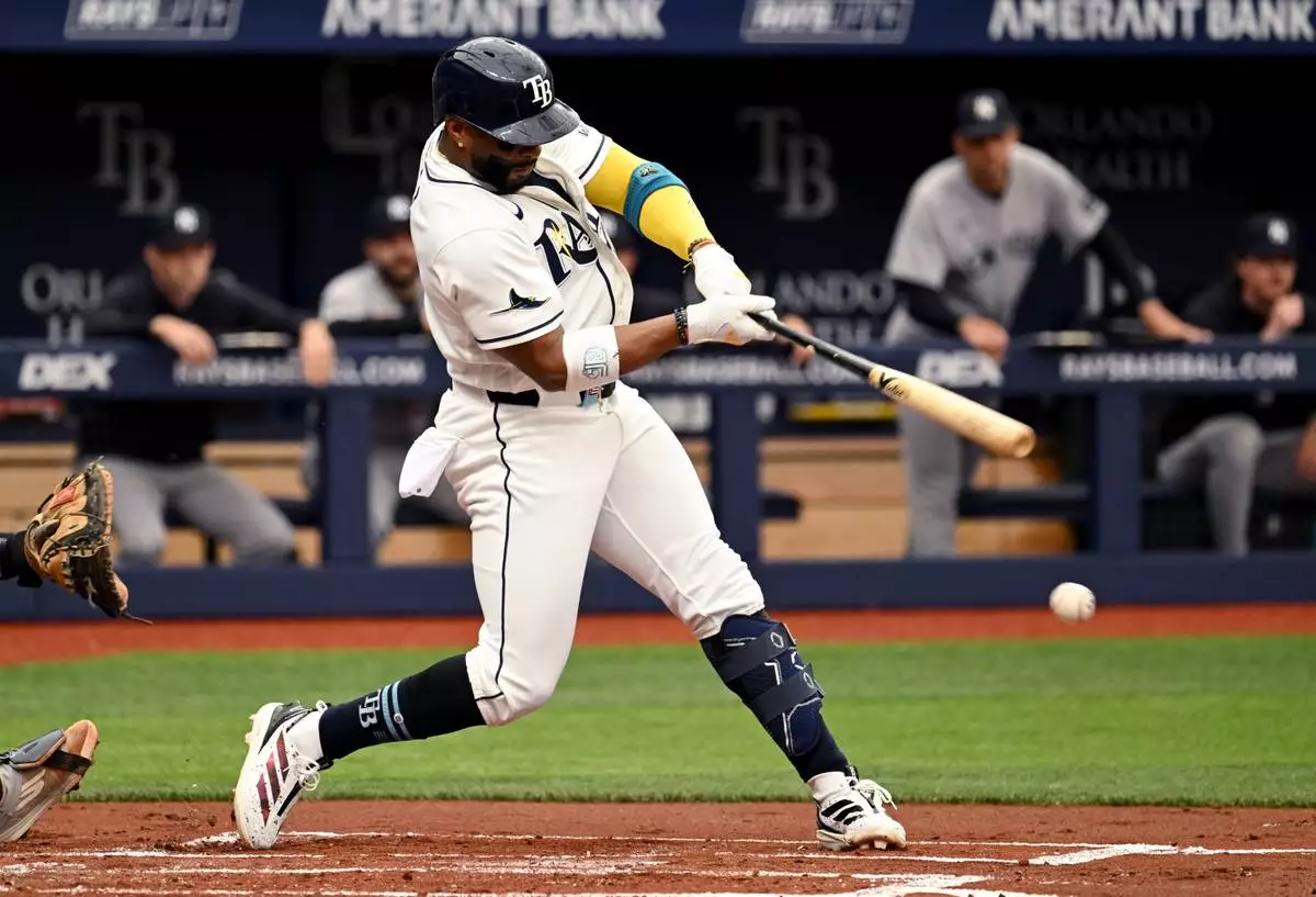 Tampa Bay Rays' Yandy Díaz hits an RBI groundout during the first inning of a baseball game against the New York Yankees, Sunday, April 12, 2026, in St. Petersburg, Fla. (AP Photo/Jason Behnken)