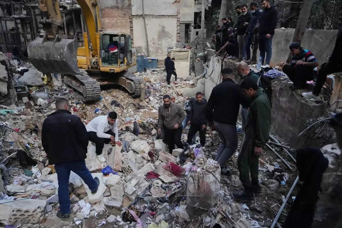 Civilians and rescue workers search through rubble at the site of a building where efforts continue to recover the body of missing woman Zahraa Aboud, 26, after it was destroyed in an Israeli airstrike on Wednesday, in central Beirut, Sunday, April 12, 2026. (AP Photo/Hassan Ammar)
