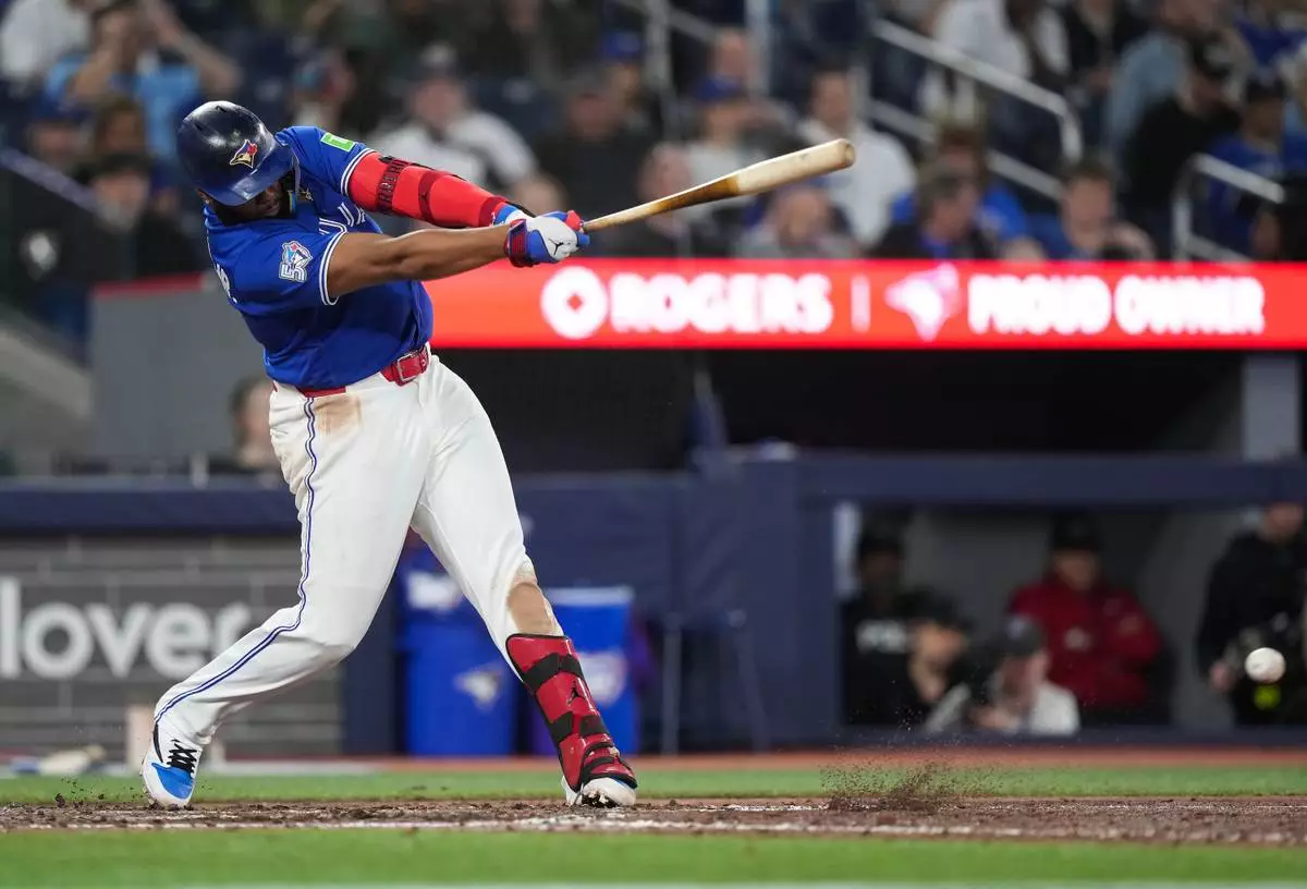 Toronto Blue Jays' Vladimir Guerrero Jr. hits a single against the Minnesota Twins during seventh-inning baseball game action in Toronto, Sunday, April 12, 2026. (Nathan Denette/The Canadian Press via AP)