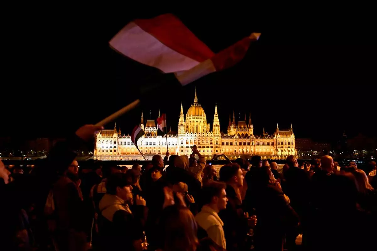 Supporters of Peter Magyar, the leader of the opposition Tisza party celebrate after a parliamentary election in Budapest, Hungary, Sunday, April 12, 2026. (AP Photo/Darko Bandic)