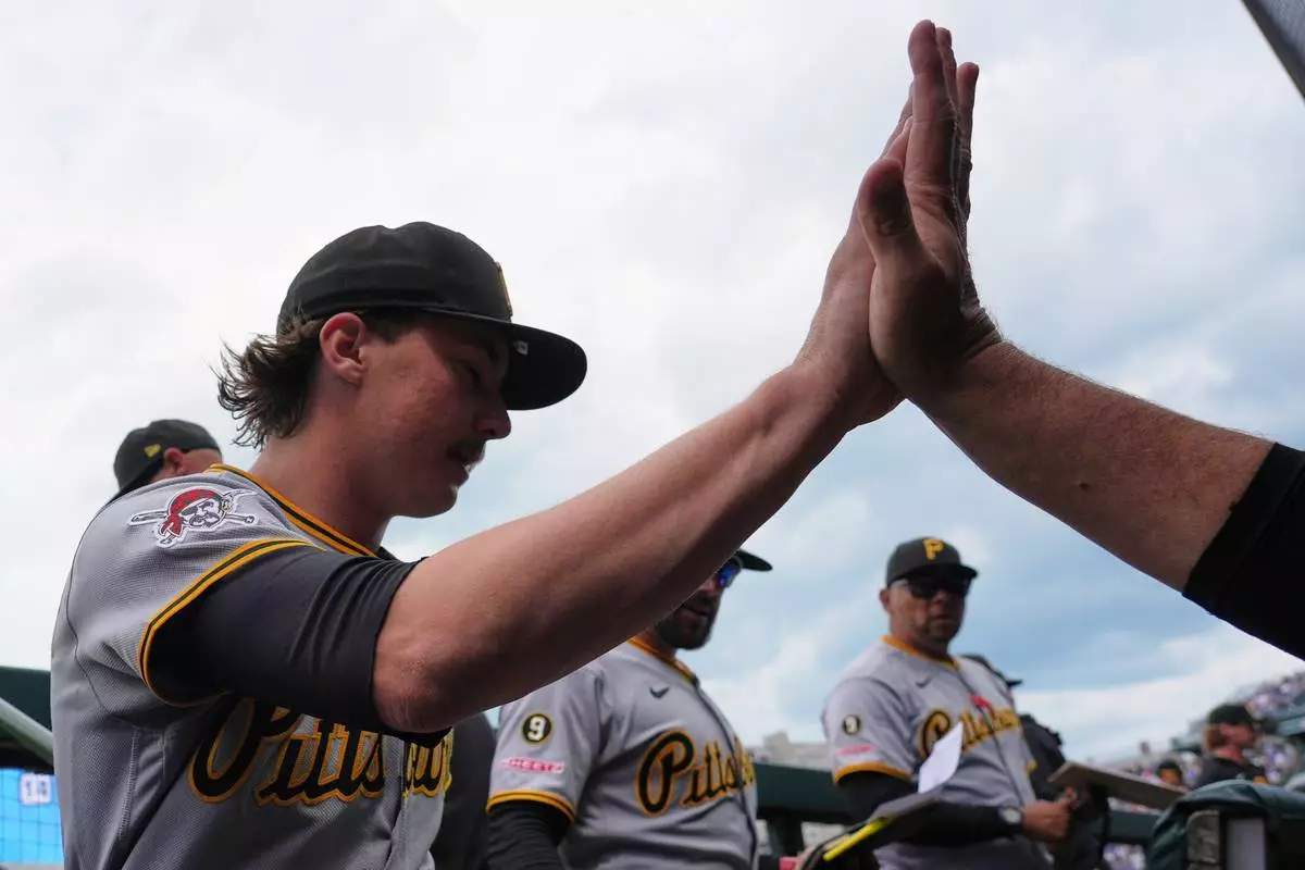 Pittsburgh Pirates starting pitcher Bubba Chandler, left, celebrates with a teammate in the dugout after first inning of a baseball game against the Chicago Cubs in Chicago, Sunday, April 12, 2026. (AP Photo/Nam Y. Huh)