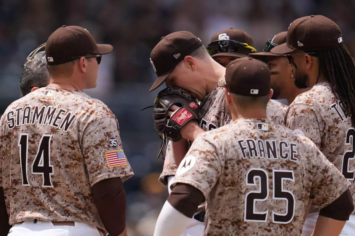 SAN DIEGO (AP) — San Diego Padres right-hander Nick Pivetta was forced from Sunday’s 7-2 win over Colorado in the fourth inning by stiffness in his pitching elbow.