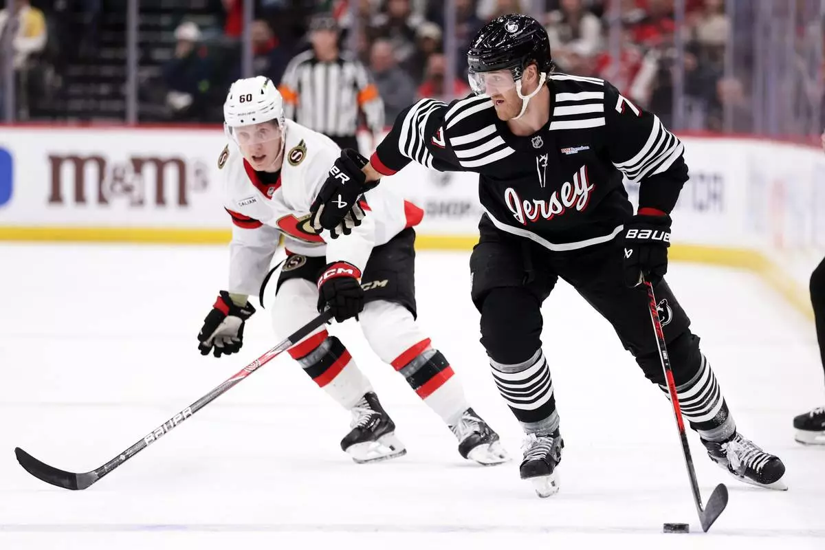 New Jersey Devils defenseman Dougie Hamilton (7) controls the puck past Ottawa Senators defenseman Lassi Thomson (60) during the first period of an NHL hockey game, Sunday, April 12, 2026, in Newark, N.J. (AP Photo/Adam Hunger)