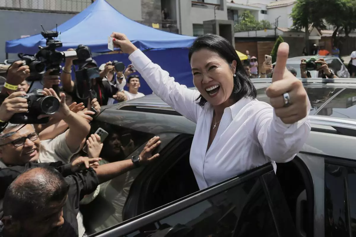 Keiko Fujimori, presidential candidate of the Popular Force party, departs a polling station after voting during general elections in Lima, Peru, Sunday, April 12, 2026. (AP Photo/Gerardo Marin)
