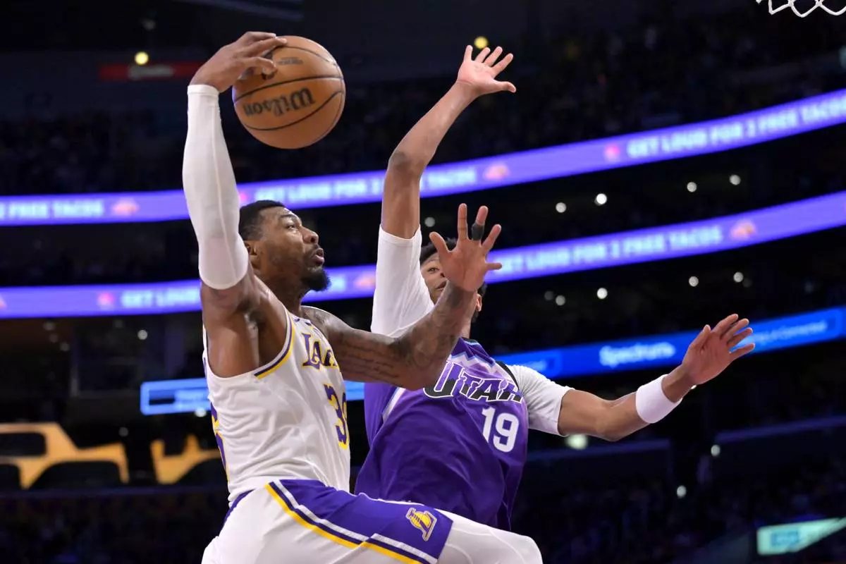 Los Angeles Lakers center Deandre Ayton (5) goes up to dunk as he is defended by Utah Jaz guard Bez Mbeng, bottom left, and forward Blake Hinson, right, during the first half of an NBA basketball game Sunday, April 12, 2026, in Los Angeles. (AP Photo/Jayne Kamin-Oncea)