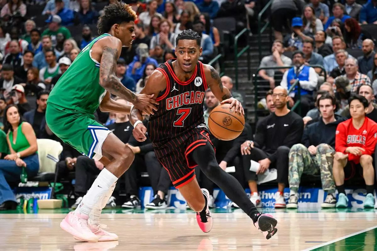 Chicago Bulls' Rob Dillingham drives against Dallas Mavericks' AJ Johnson during an NBA basketball game Sunday, April 12, 2026, in Dallas. (AP Photo/Albert Pena)