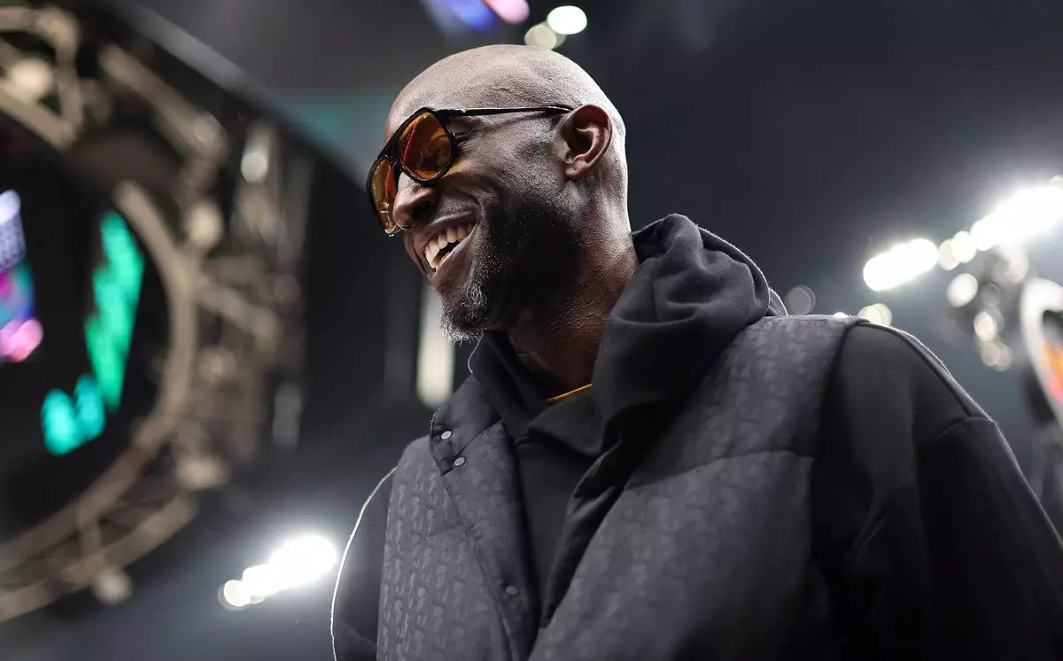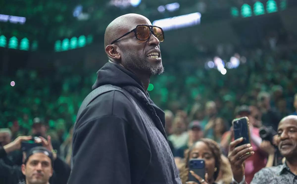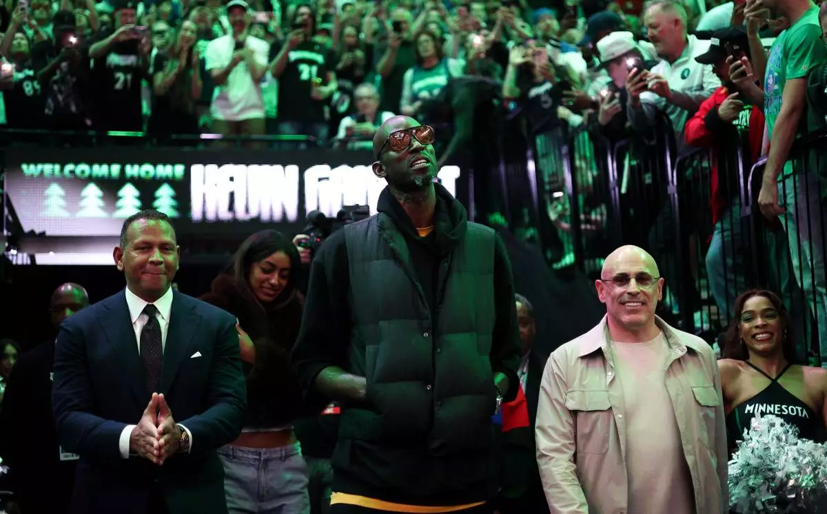Former Minnesota Timberwolves player Kevin Garnett is introduced before an NBA basketball game between the New Orleans Pelicans and the Minnesota Timberwolves Sunday, April 12, 2026, in Minneapolis. (AP Photo/Matt Krohn)