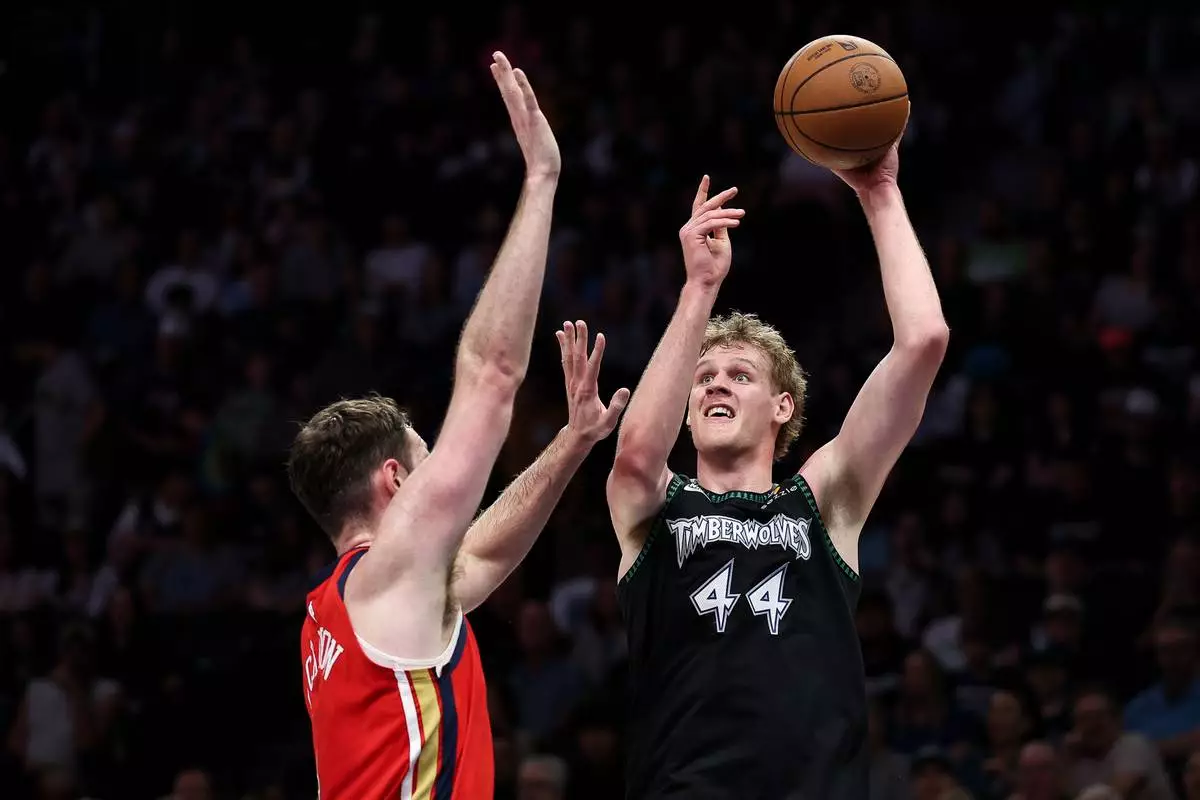 Minnesota Timberwolves center Rocco Zikarsky, right, shoots over New Orleans Pelicans center Hunter Dickinson (4) during the first half of an NBA basketball game Sunday, April 12, 2026, in Minneapolis. (AP Photo/Matt Krohn)