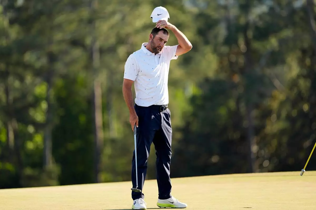 Scottie Scheffler finishes his final round of the Masters golf tournament at the Augusta National Golf Club, Sunday, April 12, 2026, in Augusta, Ga. (AP Photo/David J. Phillip)