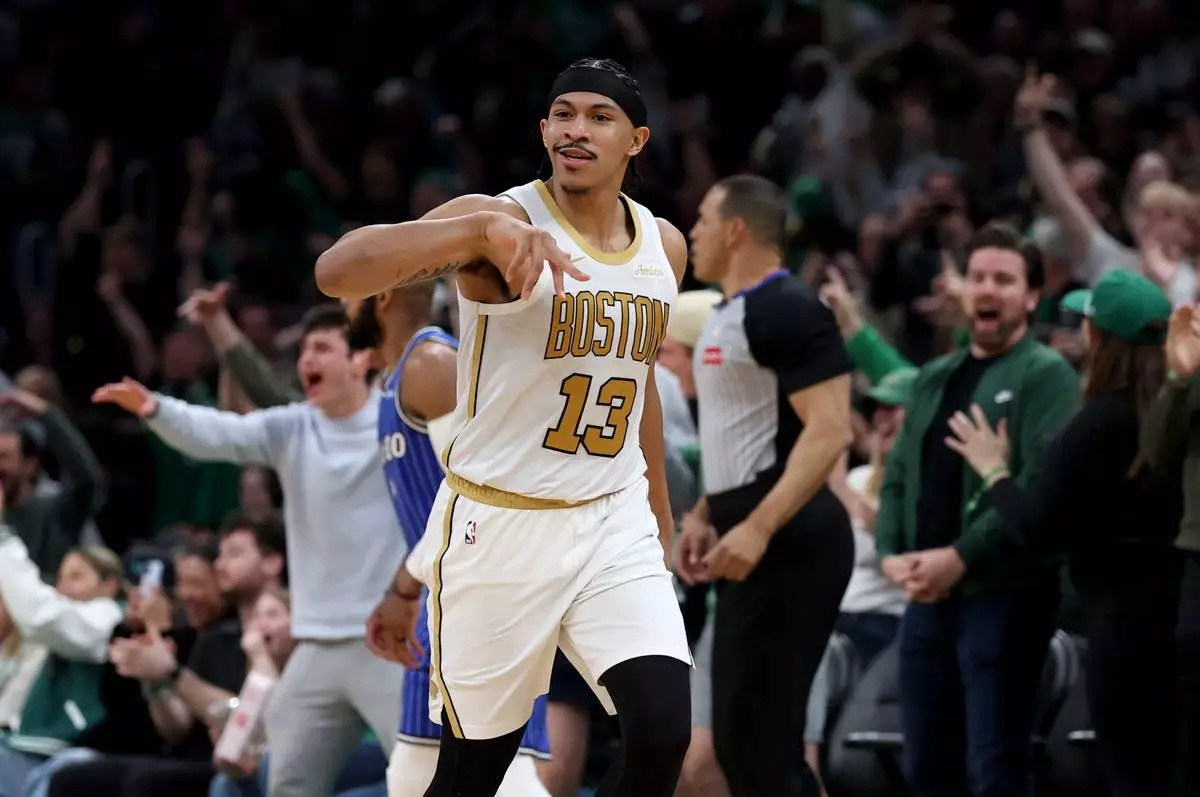 Boston Celtics forward Ron Harper Jr. (13) reacts after scoring during the second half of an NBA basketball game against Orlando Magic, Sunday, April 12, 2026, in Boston. (AP Photo/Mark Stockwell)