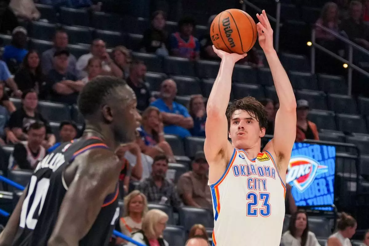 Oklahoma City Thunder forward Brooks Barnhizer, right, shoots over Phoenix Suns forward Khaman Maluach during the second half of an NBA basketball game, Sunday, April 12, 2026, in Oklahoma City. (AP Photo/Kyle Phillips)