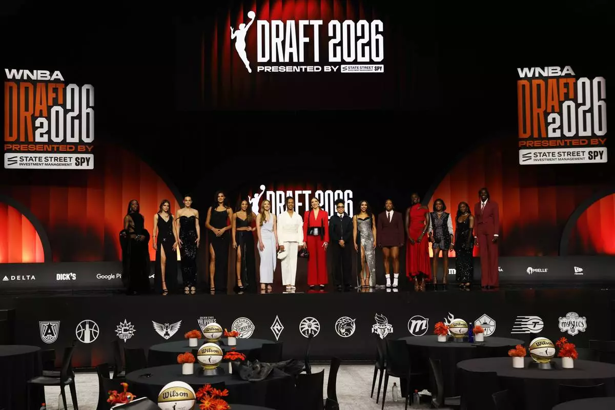WNBA prospects pose on stage before the WNBA basketball draft Monday, April 13, 2026, in New York. (AP Photo/Pamela Smith)