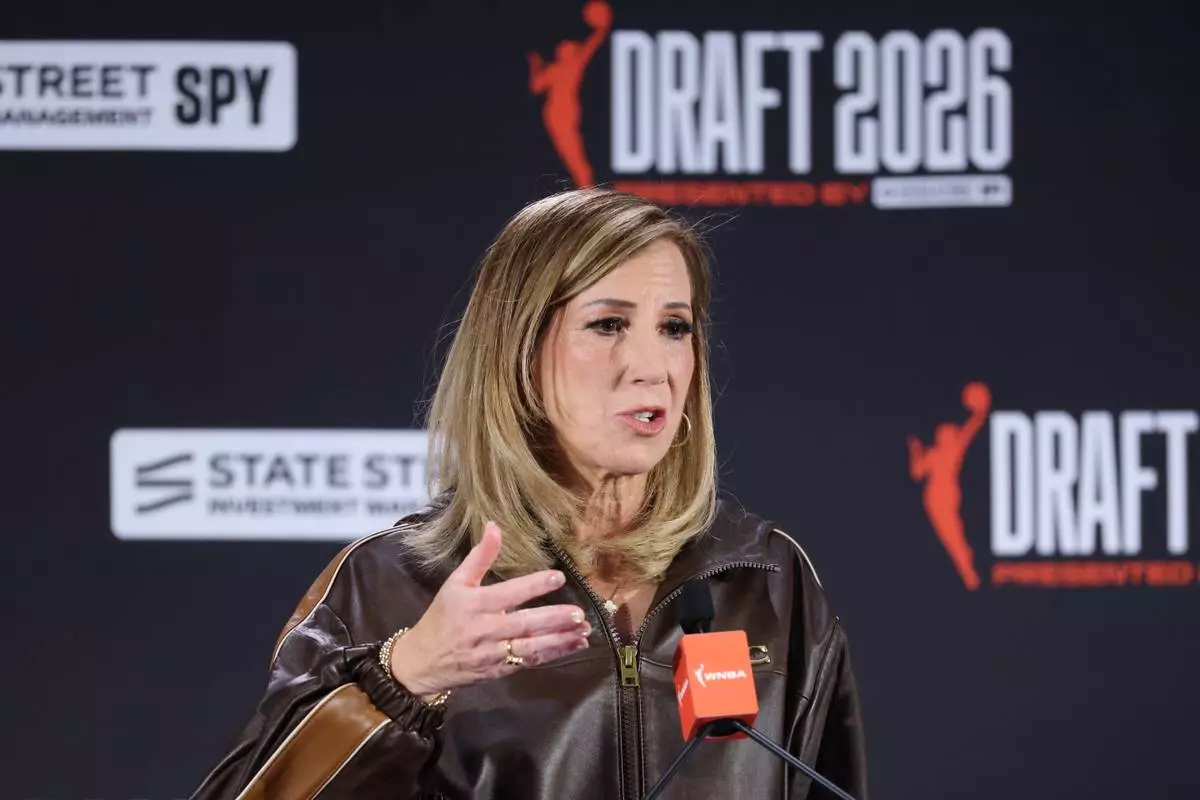 WNBA commissioner Cathy Engelbert speaks before the WNBA basketball draft Monday, April 13, 2026, in New York. (AP Photo/Pamela Smith)