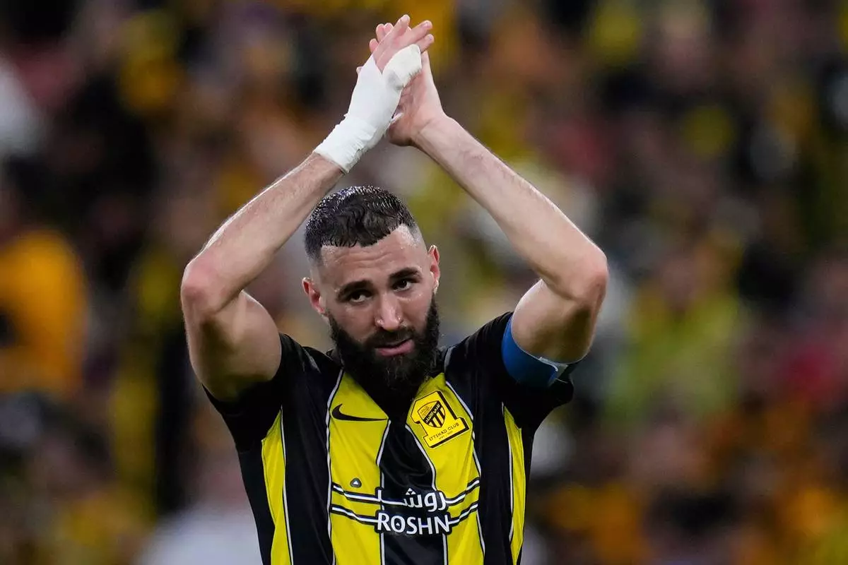 FILE - Al Ittihad's Karim Benzema celebrates at the end of the Soccer Club World Cup first round soccer match between Al Ittihad and Auckland City FC at King Abdullah Sports City stadium in Jeddah, Saudi Arabia, Dec. 12, 2023. (AP Photo/Manu Fernandez, File)