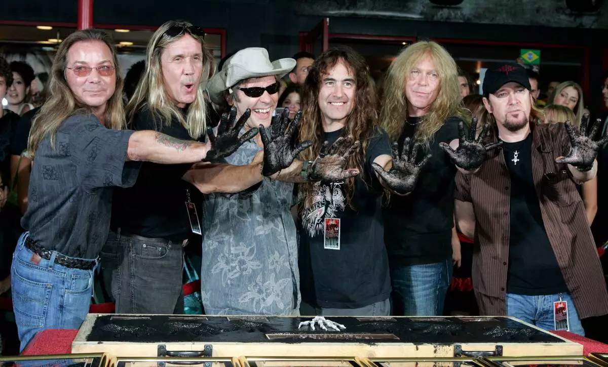 FILE - Members of the British heavy metal band Iron Maiden, from left, Dave Murray, Nicko McBrian, Bruce Dickinson, Steve Harris, Janick Gers and Adrian Smith hold up their hands after being inducted into Hollywood's Rockwalk in Los Angeles on Aug. 19, 2005. (AP Photo/Jae C. Hong, File)