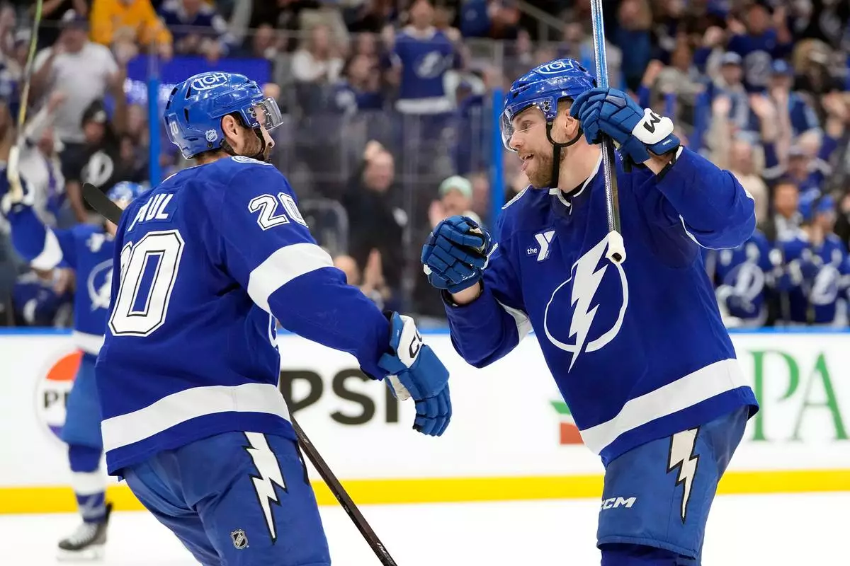 Tampa Bay Lightning defenseman Erik Cernak (81) celebrates his goal against the Detroit Red Wings with left wing Nick Paul (20) during the second period of an NHL hockey game Monday, April 13, 2026, in Tampa, Fla. (AP Photo/Chris O'Meara)