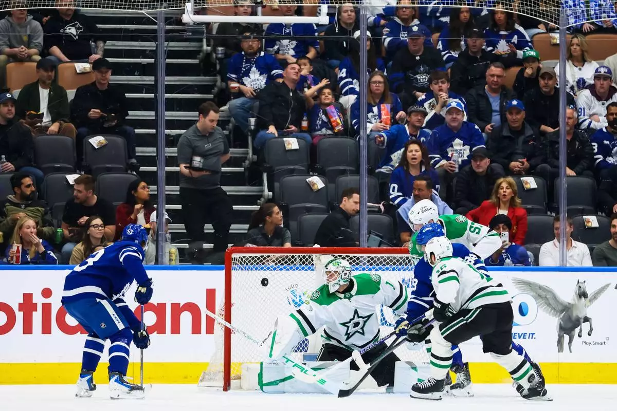 Toronto Maple Leafs right wing William Nylander (88) scores a goal on Dallas Stars goaltender Casey DeSmith (1) during the first period of an NHL hockey game, in Toronto, Monday, April 13, 2026. (Cole Burston/The Canadian Press via AP)