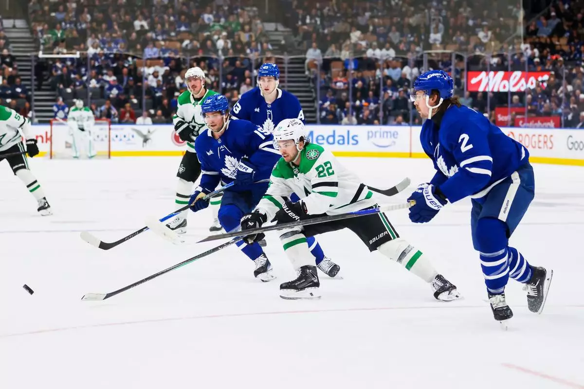 Dallas Stars center Mavrik Bourque (22) reaches for a puck against Toronto Maple Leafs defenceman Simon Benoit (2) during the first period of an NHL hockey game, in Toronto, Monday, April 13, 2026. (Cole Burston/The Canadian Press via AP)