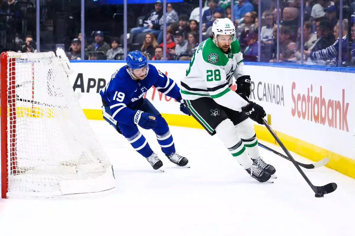 Toronto Maple Leafs center Calle Jarnkrok (19) chases Dallas Stars defenseman Alexander Petrovic (28) who brings the puck around the net during second-period NHL hockey game action in Toronto, Monday, April 13, 2026. (Cole Burston/The Canadian Press via AP)