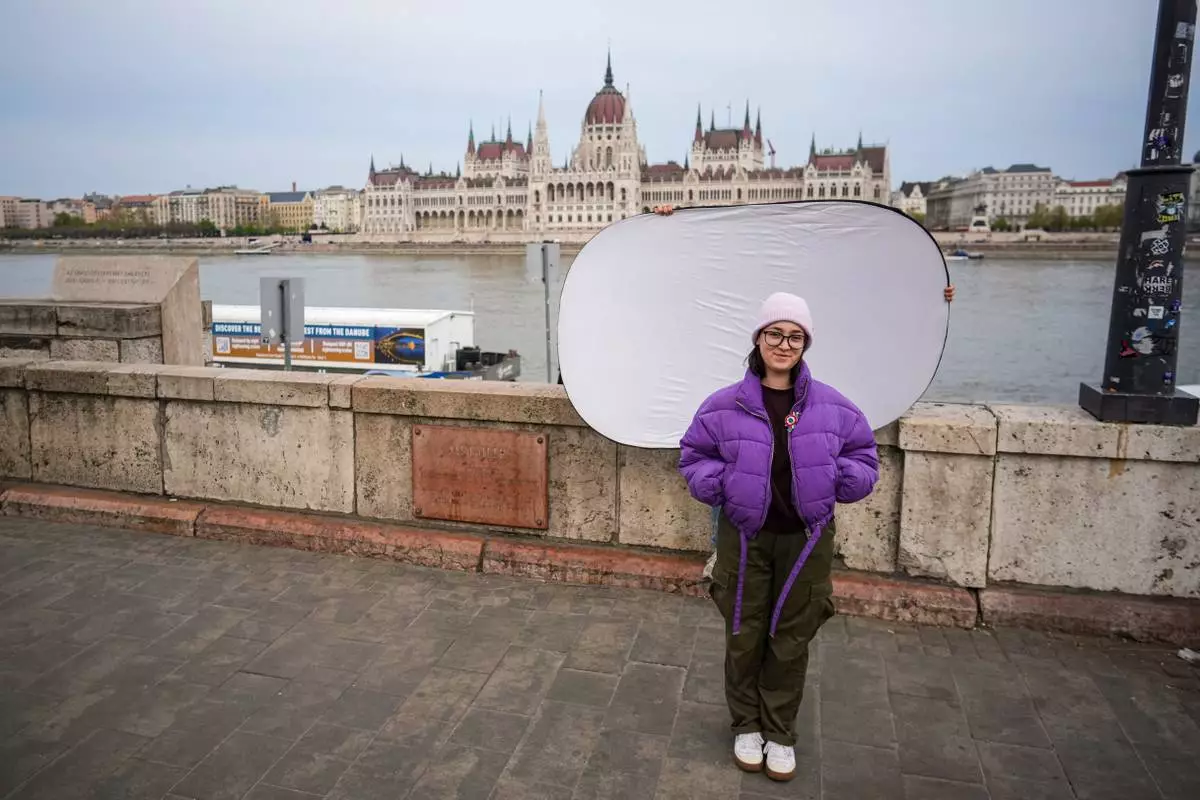Eszter Kulisek M., 24, poses for a portrait backdropped by Parliament in Budapest, Hungary, Monday, April 13, 2026. "I hope that young people will start participating in society; that they'll be more active in politics, that they'll take on our everyday challenges." (AP Photo/Petr David Josek)