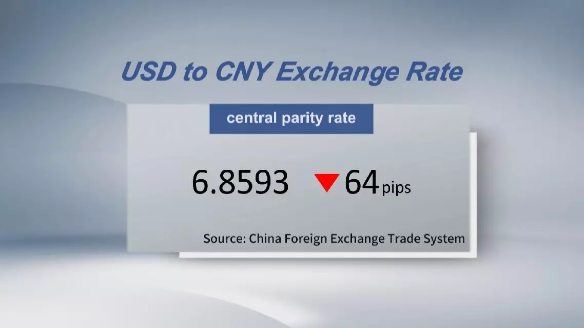 The central parity rate of the Chinese currency renminbi, or the yuan, strengthened 64 pips to 6.8593 against the U.S. dollar Tuesday, according to the China Foreign Exchange Trade System.