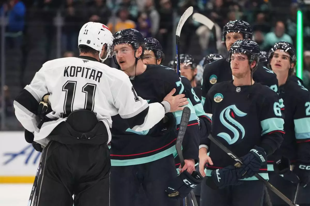 The Seattle Kraken, including center Bobby McMann, line up to greet Los Angeles Kings center Anze Kopitar (11) after a Kings win in an NHL hockey game Monday, April 13, 2026, in Seattle. (AP Photo/Lindsey Wasson)