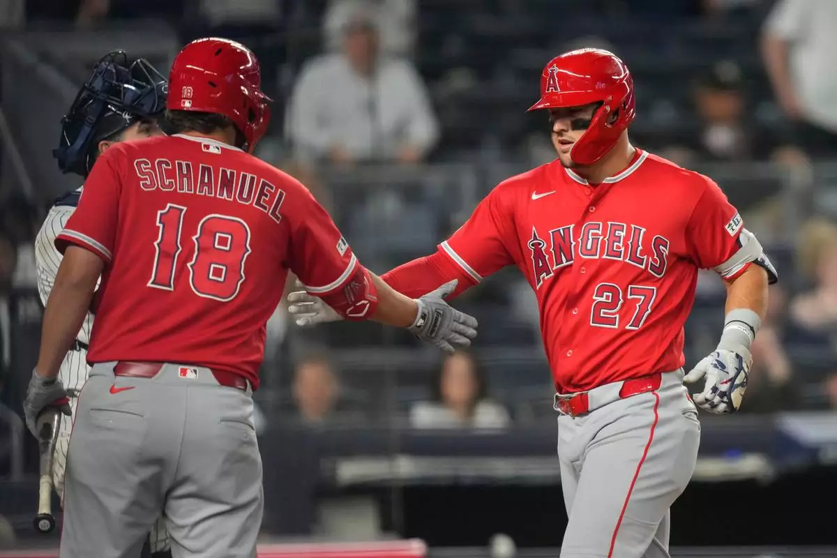 Los Angeles Angels' Mike Trout (27) celebrates with Nolan Schanuel (18) after hitting a two-run home run during the eighth inning of a baseball game against the New York Yankees, Monday, April 13, 2026, in New York. (AP Photo/Yuki Iwamura)