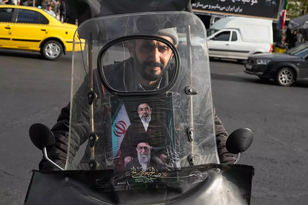 A man drives his motorbike with a poster on its windshield depicting Iran's Supreme Leader Ayatollah Mojtaba Khamenei, top, and his father, the slain Supreme Leader Ayatollah Ali Khamenei, who was killed in the U.S. and Israel strikes on Feb. 28, in downtown Tehran, Iran, Monday, April 13, 2026. (AP Photo/Vahid Salemi)