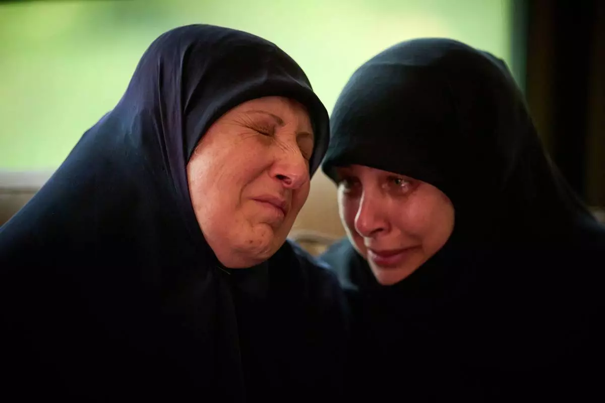 Ahlam Badawi, 51, left, mother of Hassan Ali Badawi, 31, a paramedic of the Lebanese Red Cross killed in a Israeli strike, cries during his funeral in Choueifat, Lebanon, Monday, April 13, 2026. (AP Photo/Emilio Morenatti)