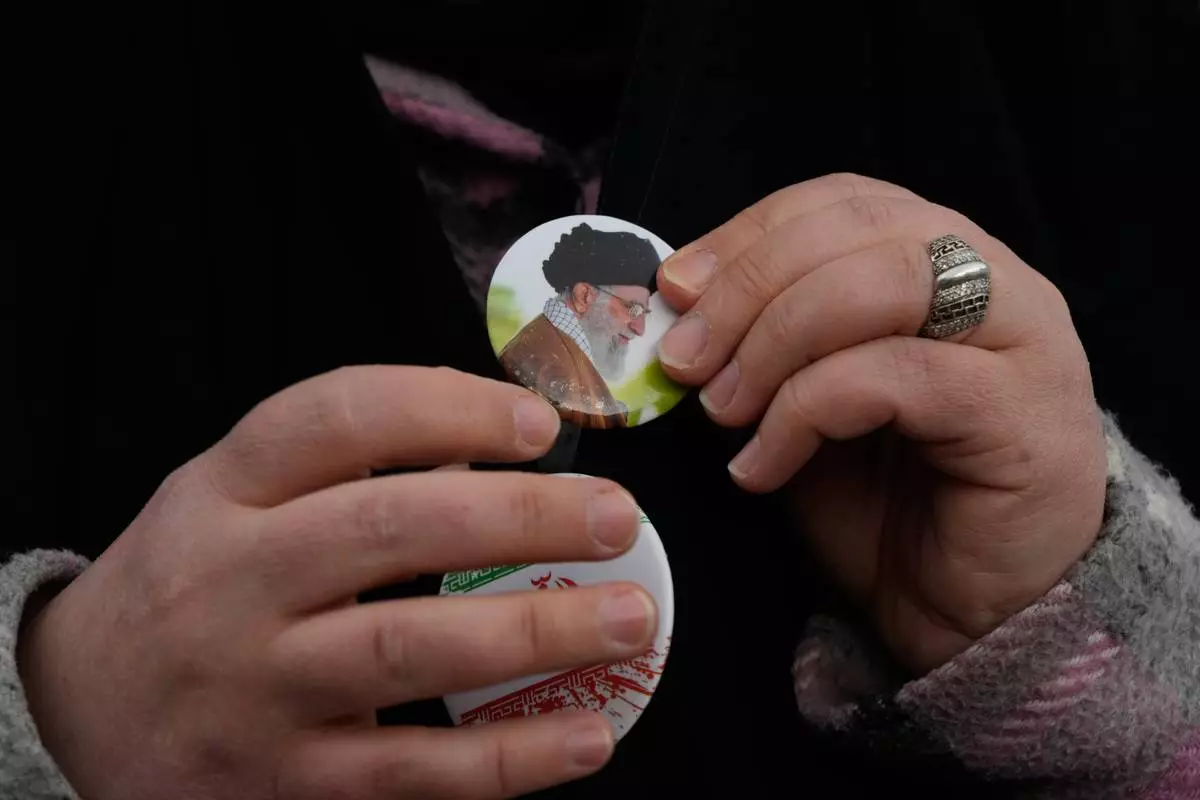 A woman wears a badge with a portrait of the late Iranian Supreme Leader Ayatollah Ali Khamenei, who was killed in the U.S. and Israel strikes on Feb. 28, during a campaign in support of the government at the Enqelab-e-Eslami, or Islamic Revolution, Square in downtown Tehran, Iran, Monday, April 13, 2026. (AP Photo/Vahid Salemi)
