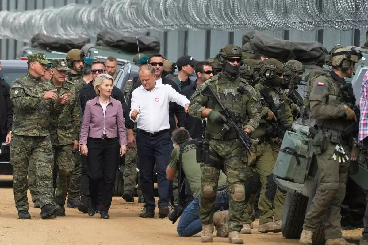 FILE - Polish Prime Minister Donald Tusk , center right, and European Commission President Ursula von der Leyen, center left, walk next to Border Guard personnel during their visit to the Polish-Belarus border, in Krynki, Poland, Aug. 31, 2025. (AP Photo/Czarek Sokolowski, file)