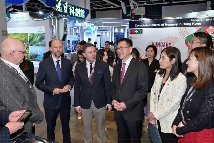 The Secretary for Innovation, Technology and Industry, Professor Sun Dong (fourth right), visited InnoEX today (April 14). Photo shows Professor Sun with the Under Secretary for Innovation, Technology and Industry, Ms Lillian Cheong (third right), the Acting Commissioner for Digital Policy, Mr Daniel Cheung (second right), and other guests. Source: HKSAR Government Press Releases