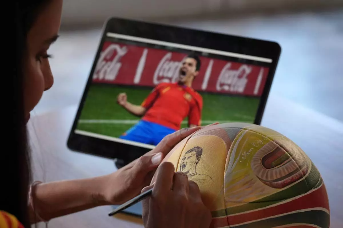 Some soccer balls take Cantero days to paint. Others take her just a couple of hours. At the unveiling of this project, she even did some work — setting up a tablet to her left, looking at an image of Spain star David Villa celebrating a goal during that 2010 World Cup.