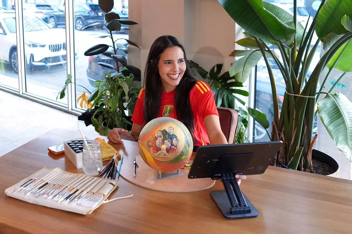 Artist Lili Cantero paints a soccer ball with images commemorating Spain's 2010 World Cup victory as part of the launch of the Wynwood United Soccer Ball Art Trail, which will showcase hand-painted soccer balls honoring historic World Cup championships inside local businesses, April 8, 2026, at Rodilla cafe in the Wynwood district of Miami. (AP Photo/Rebecca Blackwell)