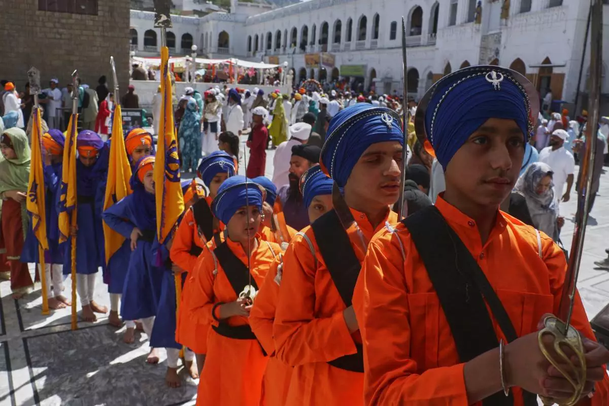 Sikh youth, in traditional dress and holding ceremonial swords, attend a ceremony to celebrate Vaisakhi festival, which also marks the New Year in Sikh tradition, at the shrine of Gurdwara Punja Sahib, the second most sacred place for Sikhs, in Hassan Abdal, Pakistan, Tuesday, April 14, 2026. (AP Photo/Anjum Naveed)