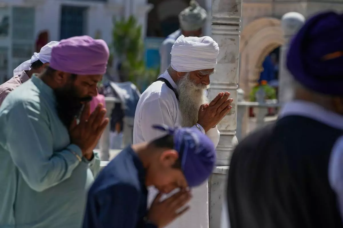 Sikh pilgrims pray as they attend a ceremony to celebrate Vaisakhi festival, which also marks the New Year in Sikh tradition, at the shrine of Gurdwara Punja Sahib, the second most sacred place for Sikhs, in Hassan Abdal, Pakistan, Tuesday, April 14, 2026. (AP Photo/Anjum Naveed)
