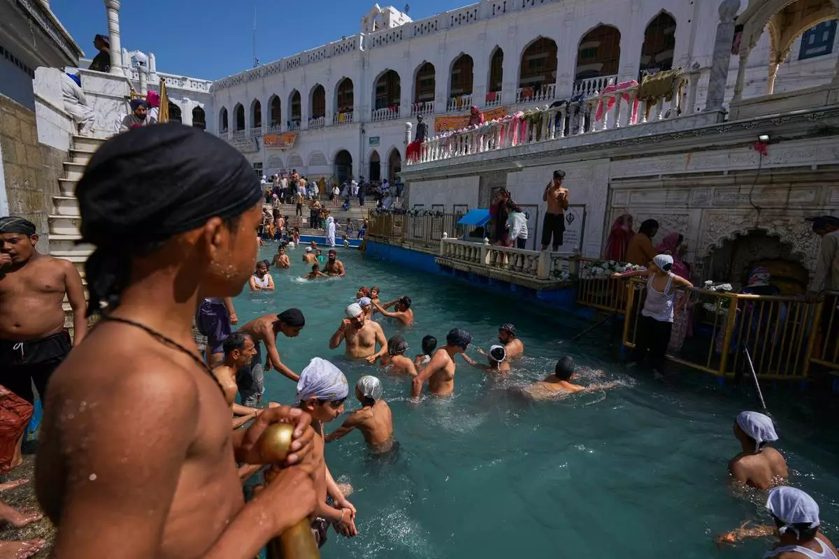 Sikh youth take holy dip in a pool during Vaisakhi festival, which also marks the New Year in Sikh tradition, at the shrine of Gurdwara Punja Sahib, the second most sacred place for Sikhs, in Hassan Abdal, Pakistan, Tuesday, April 14, 2026. (AP Photo/Anjum Naveed)
