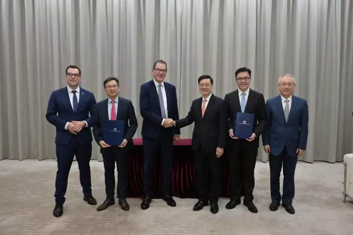 The Innovation, Technology and Industry Bureau and the United Nations Industrial Development Organization (UNIDO) signed a joint statement on collaboration to advance industrial development, innovation and digital transformation today (April 14). Photo shows the Chief Executive, Mr John Lee (third right); the Director General of UNIDO, Dr Gerd Müller (third left); the Secretary for Innovation, Technology and Industry, Professor Sun Dong (second right); the Deputy to the Director General of UNIDO and the Managing Director of the Directorate of Technical Co-operation and Sustainable Industrial Development, Mr Zou Ciyong (second left); the Deputy Commissioner of the Office of the Commissioner of the Ministry of Foreign Affairs in the Hong Kong Special Administrative Region, Mr Li Yongsheng (first right), and the Chief of Cabinet of UNIDO, Mr Manuel Mattiat (first left), at the signing ceremony. Source: HKSAR Government Press Releases