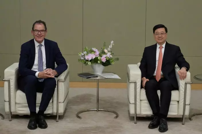 The Chief Executive, Mr John Lee (right), met with the Director General of the United Nations Industrial Development Organization, Dr Gerd Müller (left), today (April 14). Source: HKSAR Government Press Releases