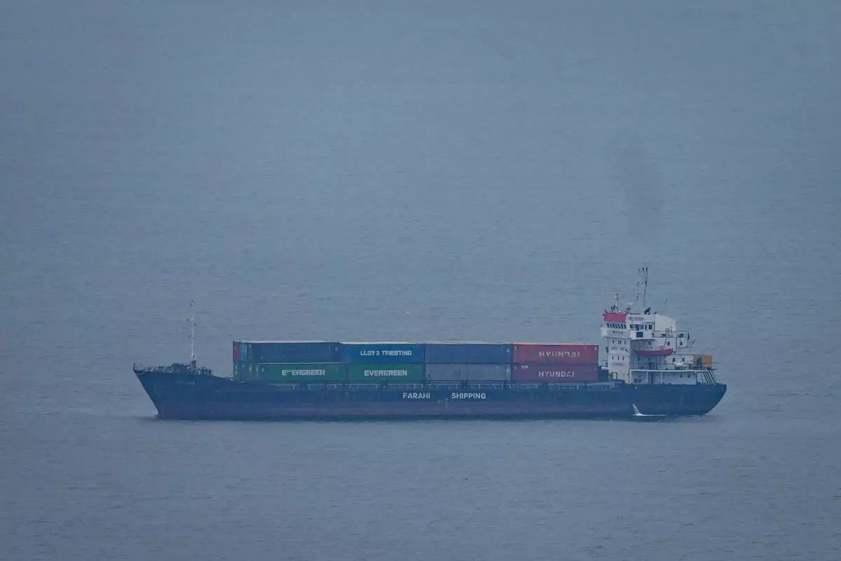 A cargo ship sails in the Persian Gulf towards Dubai port as seen from Ajman, United Arab Emirates, Tuesday, April 14, 2026. (AP Photo)