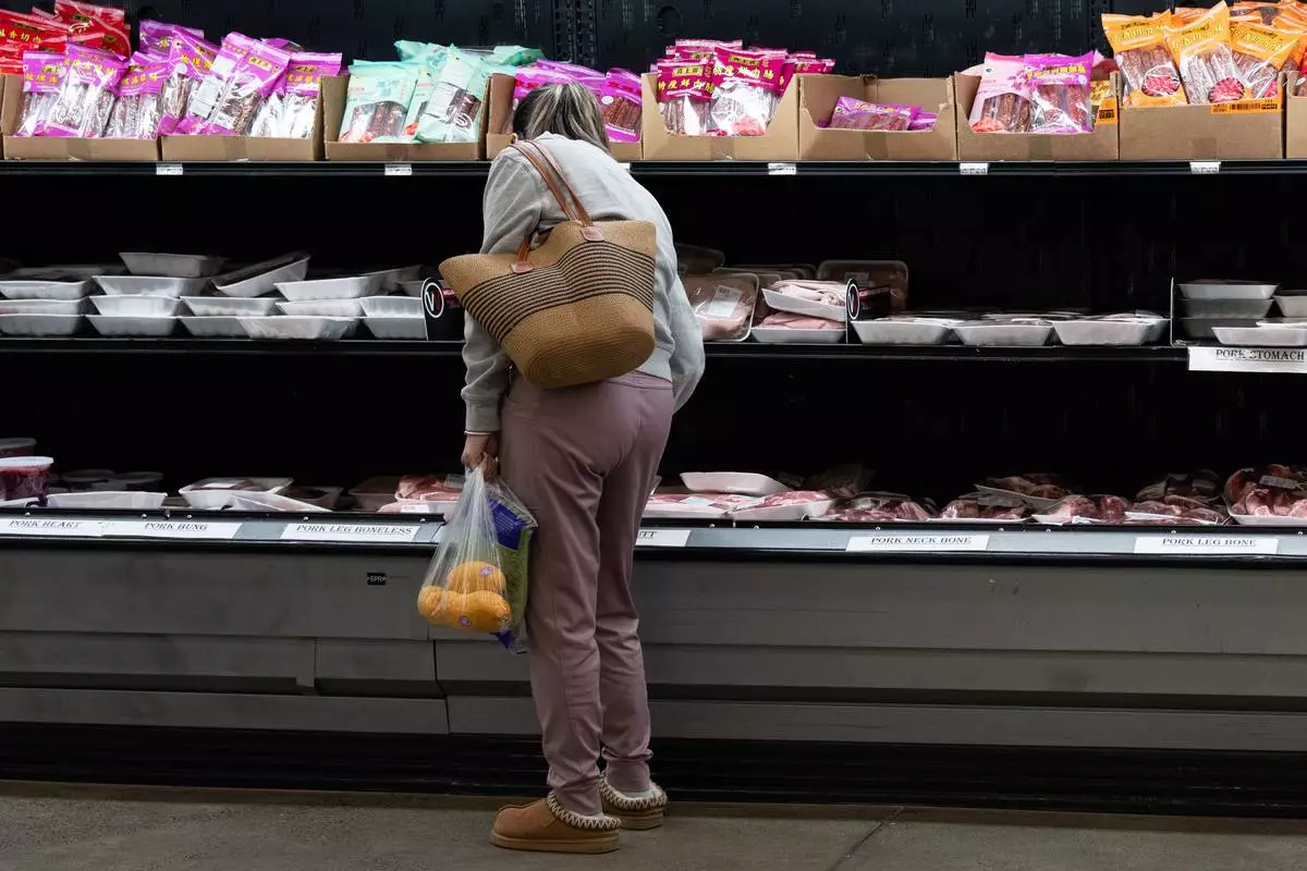 A customer shops in the meat aisle at a grocery store in Portland, Ore., Wednesday, April 8, 2026. (AP Photo/Jenny Kane)