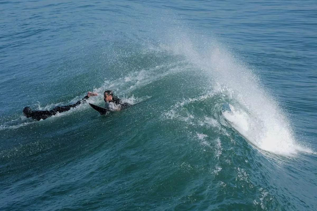 Surfers pass under a wave alongside the Imperial Beach pier Wednesday, March 11, 2026, in Imperial Beach, Calif. (AP Photo/Gregory Bull)